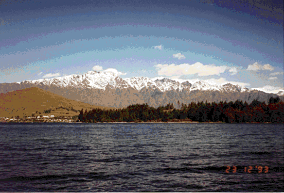 view of Queenstown and the Remarkables, the mountain range nearby.